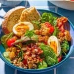 This hearty gluten-free breakfast salad with lentils, jammy eggs, prosciutto, herby potato “croutons,” and tender greens is a savory, filling meal that works any time of day.