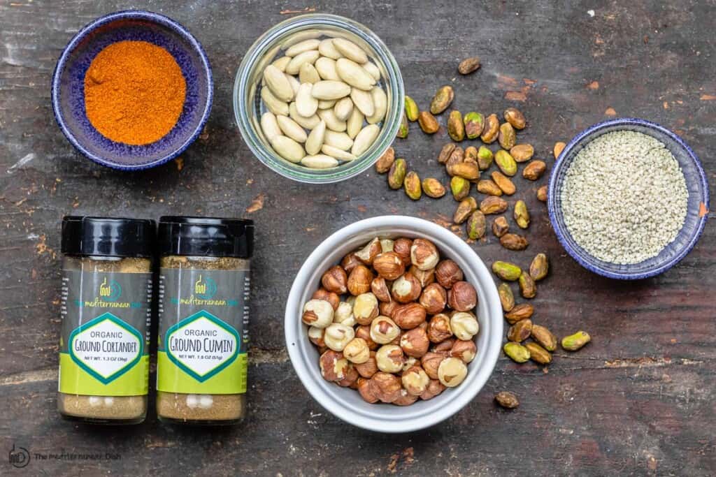 While there are no hard rules, you’ll find some common ingredients. Sesame seeds are a key –they’re cheaper and available in most Egyptian homes– along with warm spices like cumin, coriander and fennel seeds. And you’ll see coarsely chopped nuts like peanuts (again the cheaper option) or hazelnuts, pistachios, or walnuts. You can use one particular nut or a combination as in my recipe here.