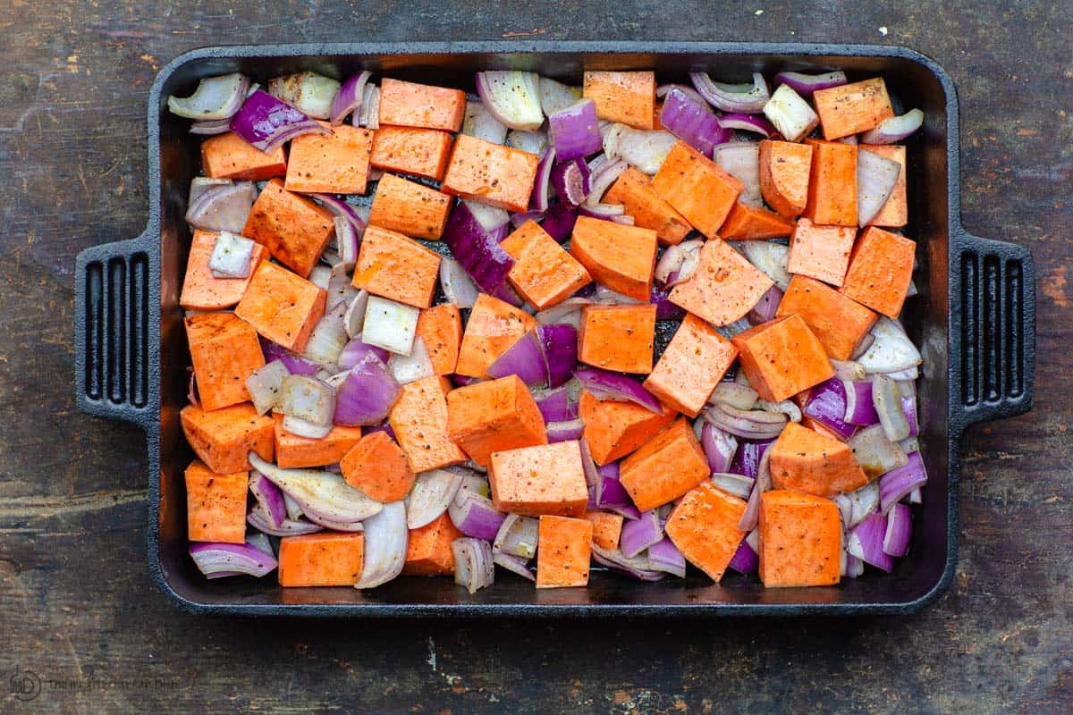 - Transfer to a sheet pan. Spread the sweet potatoes and onions well in one single layer (do not crowd the pan.)