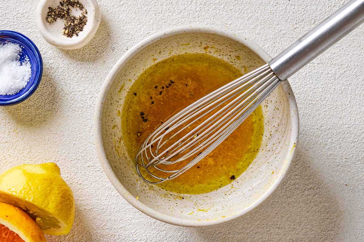 - Prepare the dressing: Zest 1/2 of an orange and 1/2 of a lemon into a small bowl, then juice in 1 tablespoon orange juice and 2 tablespoons lemon juice. Whisk in 3 tablespoons olive oil, 2 teaspoons honey, and salt and pepper to taste.