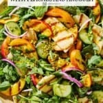 This elegant halloumi salad, inspired by Cypriot cuisine, layers peppery arugula with sweet griddled peaches, salty halloumi, cooling cucumber, biting red onion, fresh mint, and crunchy pistachios. A citrusy dressing marries the flavors for a colorful summer salad everyone will love!