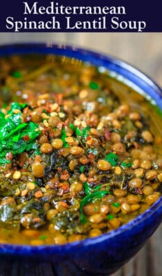This Mediterranean spicy spinach lentil soup is a flavorful and hearty one-pot dinner! You don’t need to add a thing but your favorite pita or freshly-baked rustic Italian bread. Because lentils pack lots of protein and fiber, they make a great substitute for meat. But if you absolutely need your meat fix, this lentil soup recipe pairs well with a quick side of your favorite sausage (I prefer spicy).