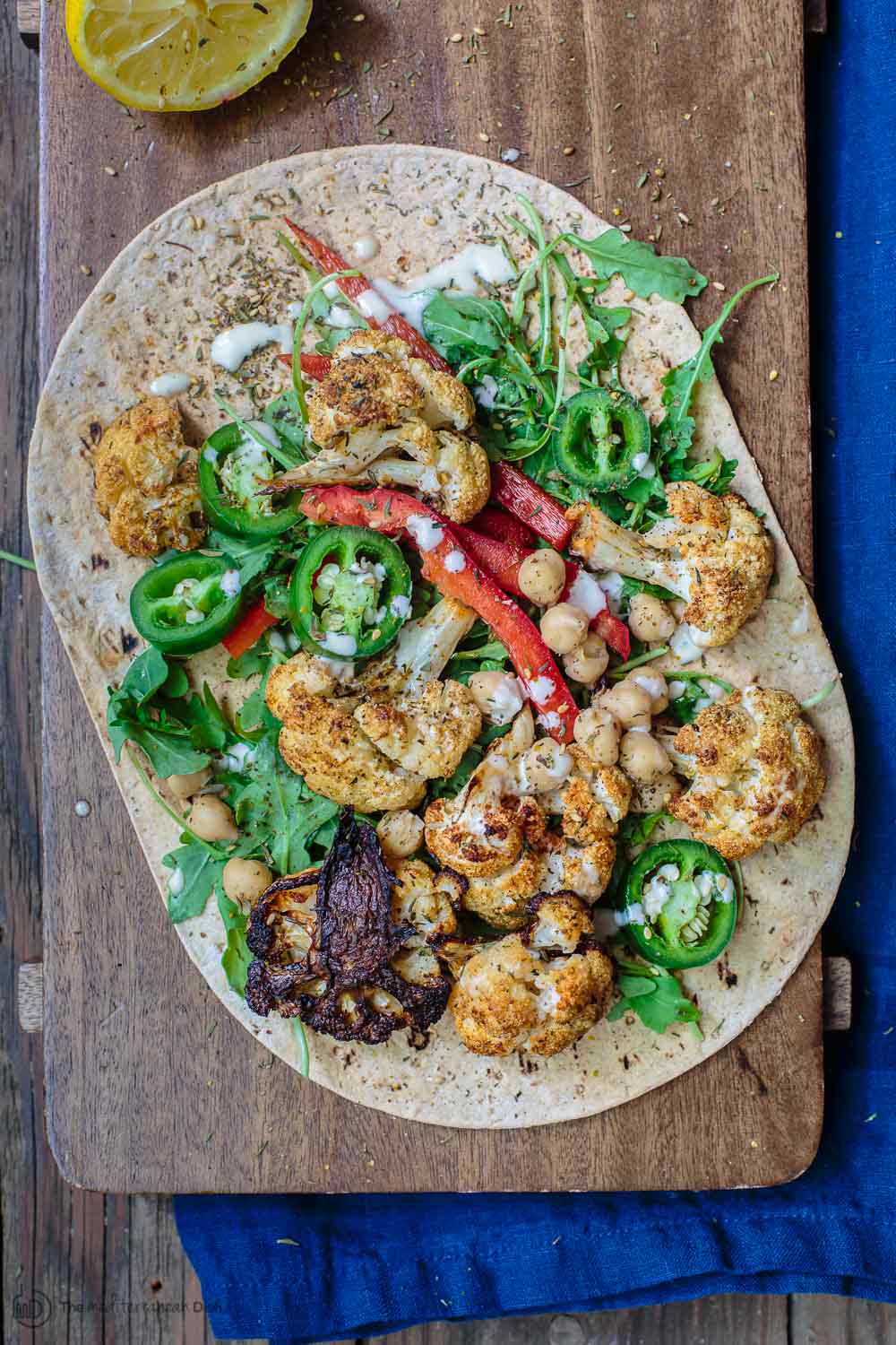 - Assemble the Mediterranean vegan wraps. Lay flatbreads flat, spread some tahini sauce on top. Add roasted cauliflower, and arugula salad. Drizzle with more tahini and roll the flatbreads from one end to another making 4 sandwich wraps. Enjoy!