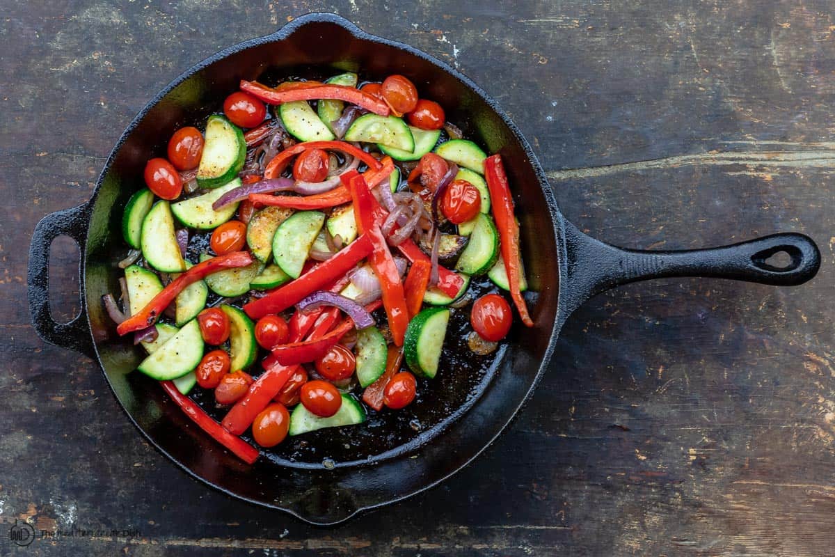 - Saute the veggies. If needed, add a little bit more olive oil to the skillet. Add the zucchini, bell peppers, onion, and tomatoes. Season with salt and pepper. Cook, tossing occasionally, until the veggies have softened, 6 to 7 minutes or so.