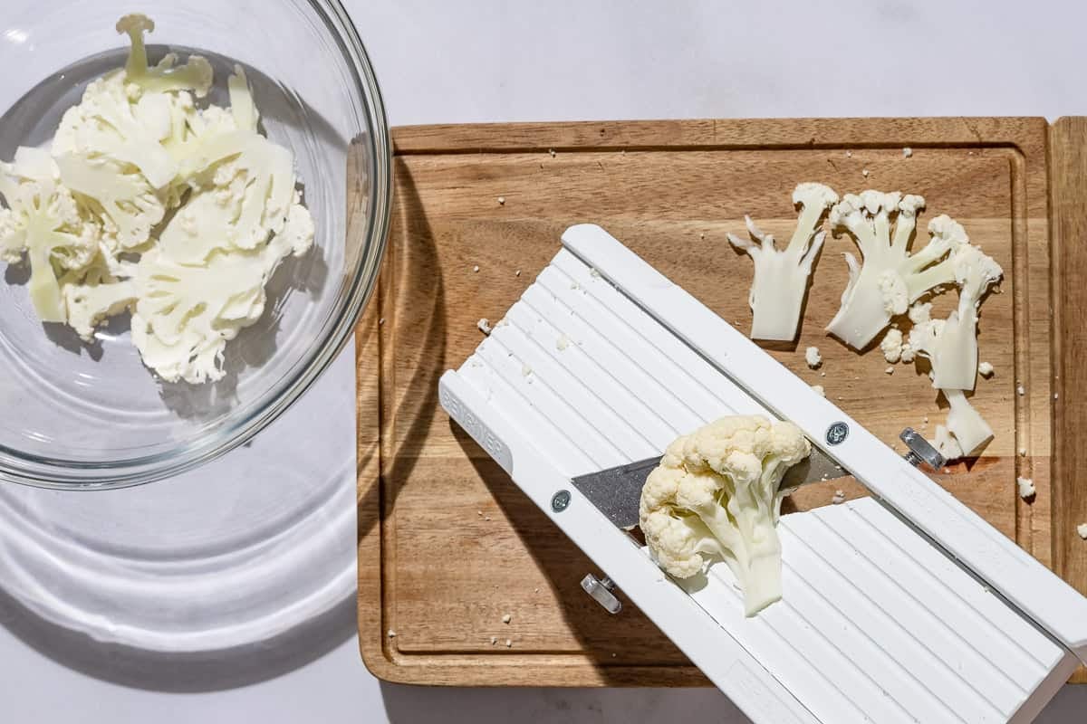 - Prep the cauliflower. Trim off the cauliflower’s thick base and discard along with the leaves. Use your hands or the tip of your knife to break them into large florets. Slice the florets as thin as possible–ideally no thicker than 1/8-inch, preferably using a mandoline.