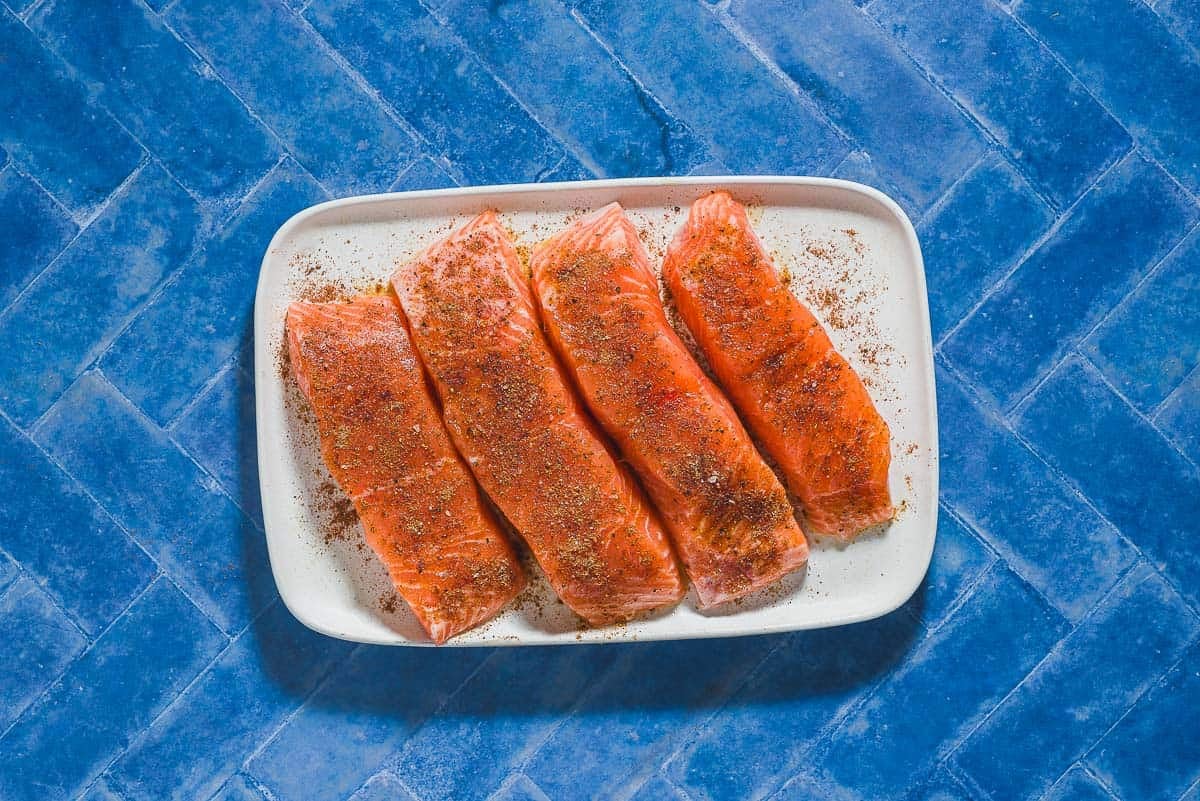 - Prepare salmon. Meanwhile, brush 4 skinless salmon fillets, each about 4 to 5 ounces, on all sides with 1 tablespoon extra virgin olive oil. Sprinkle the remaining teaspoon of spice mixture onto the fillets.