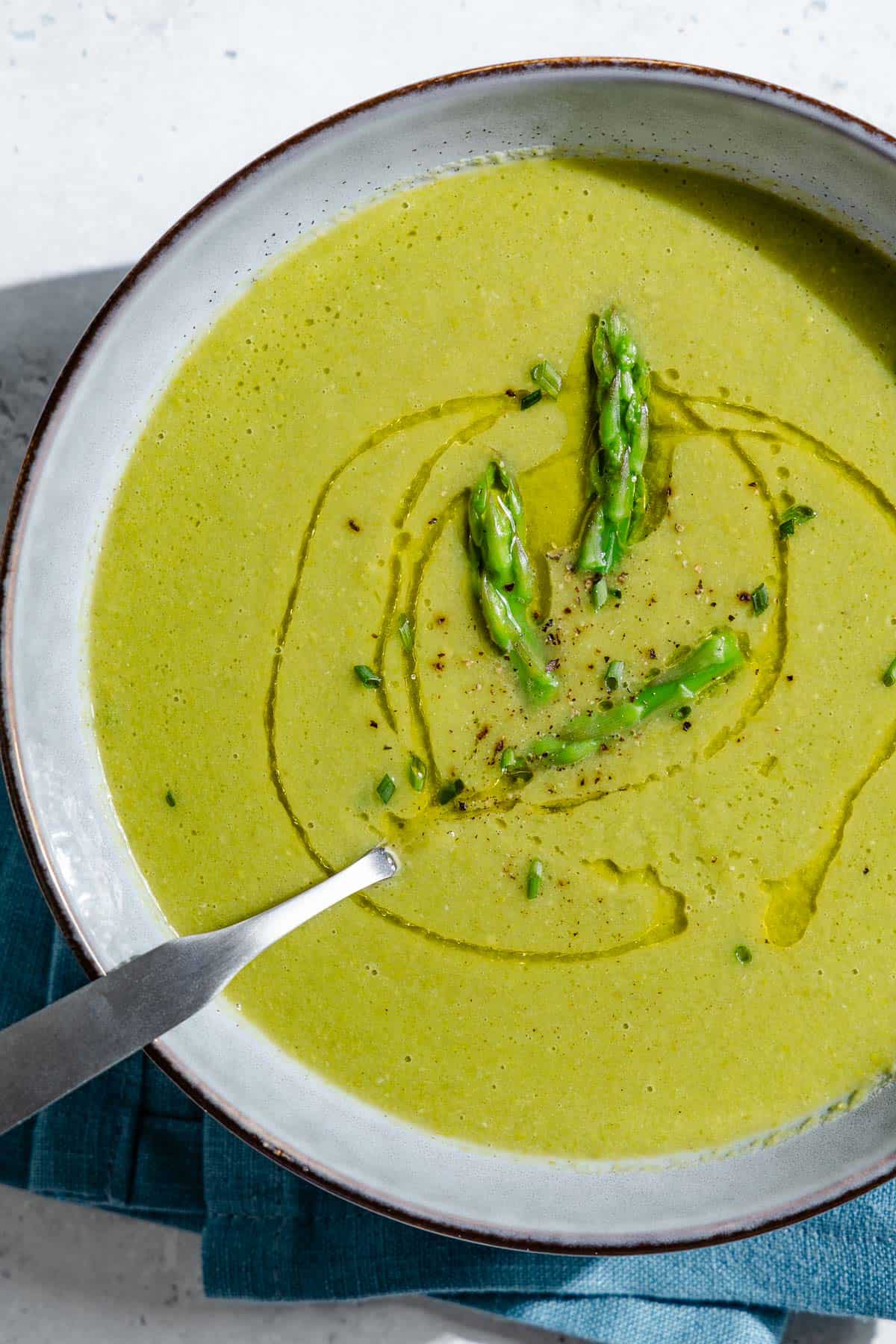You only need about 30 minutes to make this vegan asparagus soup with spring peas and leeks. The vegetables are the star of the show here, blending into a velvety, creamy soup, elegant enough to be served as a first course.