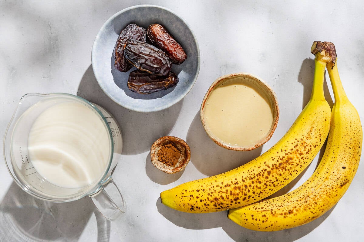 - Make the shake: To a blender, add 2 frozen bananas (sliced or whole), 1/4 cup of tahini, 1 1/2 cups of unsweetened almond milk, 1/4 cup of ice (about a handful), and a pinch of cinnamon. Tear 4 Medjool dates into pieces and add, discarding the pit as you go.