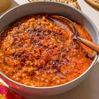 This Turkish bulgur and red lentil stew is full of warm spice. It’s a hearty vegetarian stew finished with Aleppo pepper and mint-infused olive oil and lemon.