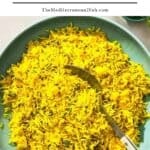 • Rest, fluff, and serve: Remove rice from heat and leave covered for 10 minutes to allow the rice to steam. Uncover and gently fluff with a fork. Spoon into a dish and serve.Turmeric rice in a serving bowl with a spoon.