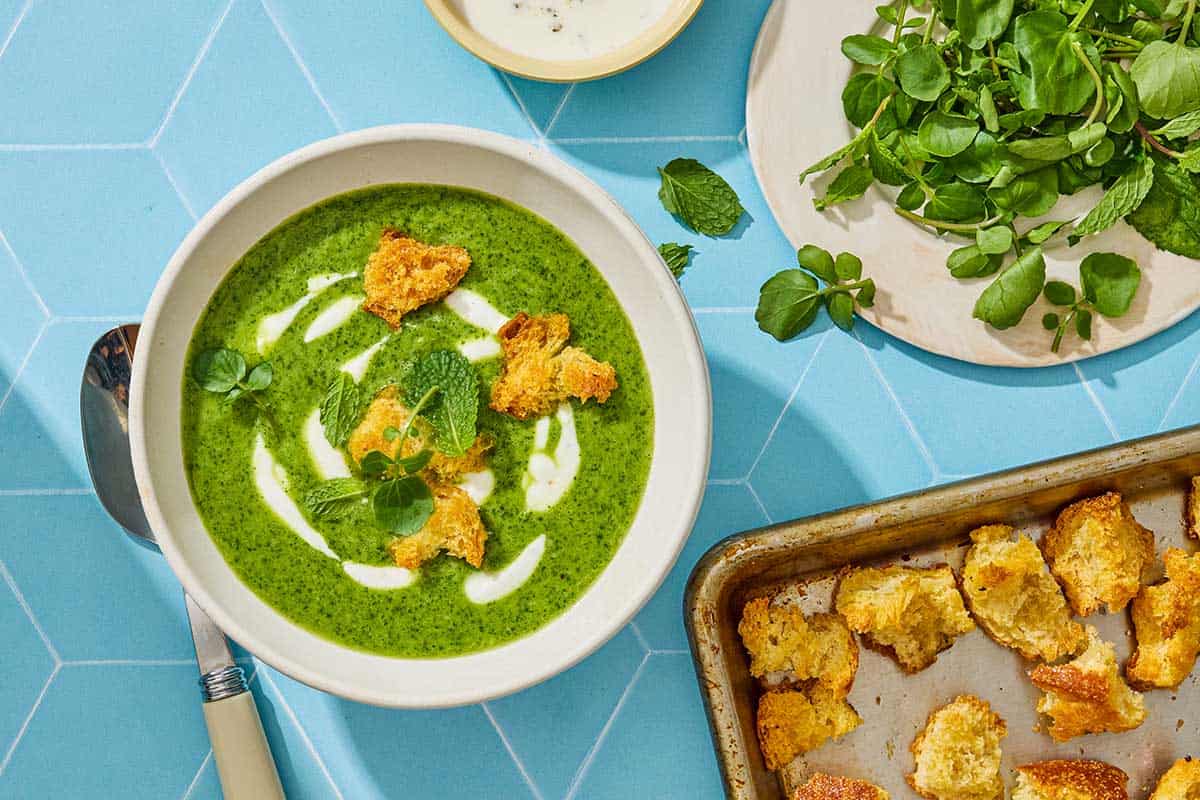 This minty, bright-green watercress soup tastes like springtime in a bowl. Made with peas, leeks, and heaps of fresh watercress, it’s delicious both hot or cold, with a fresh, clean flavor and just a hint of pepper.